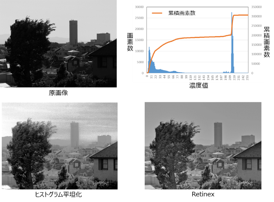 図4で、画像の右下や玄関の影で見えにくいところに注目すると、Retinexではっきりと見えているのに対し、ヒストグラム平坦化では原画像とあまり変化はありません。これは、原画像の右に示すヒストグラムで累積画素数が比較的直線上に伸びていることからわかるように、原画像がヒストグラム平坦化後の画像に近いことから改善効果が見られなかったと言えます。