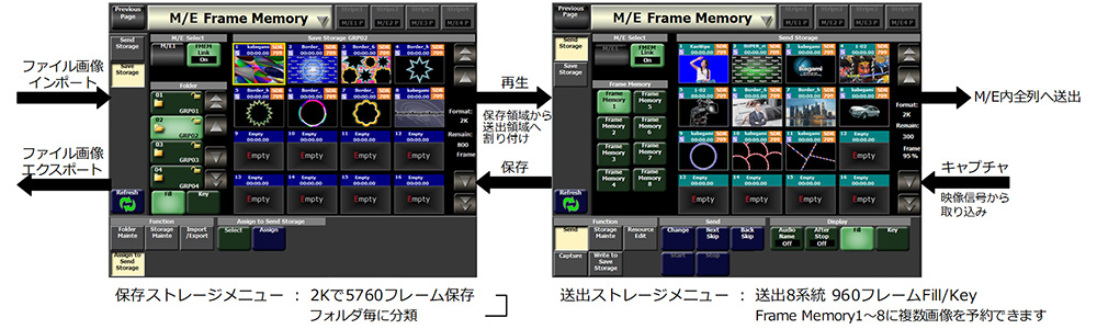 ●M/E内蔵フレームメモリの保存ストレージには2Kで最大5760フレーム、送出ストレージには960フレームFill/Keyの動画静止画を登録可能