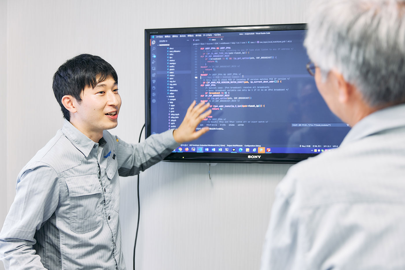 私が携わっているのは、放送事業の映像をネットワークの技術を使って通信するシステムMedia over IP製品のソフトウェア開発です。プログラミングというのは、実現したいことをどのようにすればできるのかをC言語やpythonといった言語を使って仕組みを構築していく仕事。ゼロからイチを生み出すためには、ベースとなる様々な製品に関する知識や技術を知っておくことが求められます。そして、地道にトライアンドエラーを繰り返し続けられる粘り強さが必要です。上手くいかない時も答えはひとつじゃないとやり続けるしかありません。そんな困難を乗り越えた先にある「ゴールの達成感」こそが、私にとっての一番のやりがいです。喜びしか感じない最高の瞬間ですね。